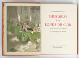 JOINT : COURTELINE (Georges). Messieurs les Ronds-de-Cuir. Tableau-roman de la vie de bureau. Monte-Carlo, Aux Éditions du Livre, s. d. [1949]. In-8°, basane fauve (reliure de l'époque). Illustrations en couleurs par DUBOUT. Tiré à 5 000 exemplaires sur grand vélin Crèvecœur, celui-ci n° 2440.