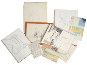 JOINT : cinq cahiers de croquis [circa 1960] avec texte manuscrit en allemand & un dessin encadré « 2eme attend pour l'embarquement » (300 x 240 mm), par Nicolaï-Heim (?).