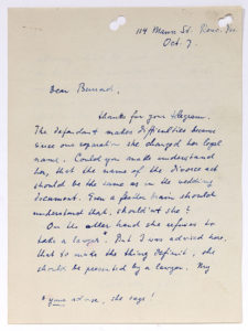 cause des difficultés : depuis leur séparation, elle a changé son nom légal. Il faut lui faire comprendre que le nom figurant sur l’acte de divorce doit être le même que sur l’acte de mariage : « Even a feather brain should understand that, shouldn’t she ? ». De plus elle refuse de prendre un avocat, sur le conseil de Reiss, dit-elle. Elle devrait être représentée par un avocat, mais s’obstine à ne pas comprendre ; sans doute craint-elle la dépense : « Probably her famous fear to spend a little money is involved in that matter »… Il prie Reiss de lui expliquer qu’il ne lui en coûterait pas plus de 50 $, si elle accepte l’avocat proposé par l’avocat d’Ernst. Si elle ne peut s’en acquitter, il propose de l’aider à payer, etc.