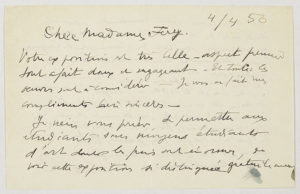 étudiants d’art dont les frais sont énormes, de voir cette exposition si distinguée gratuitement », notamment les étudiants des Arts décoratifs de Nice, et le groupe des peintres de Vence et de Cagnes. Il fait cette demande « comme président d’honneur de votre société UMAM, citoyen d’honneur de Nice et bienfaiteur de votre bibliothèque »…