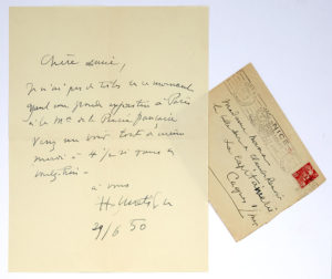 grande exposition à Paris à la Mon de la Pensée française. Venez me voir tout de même mardi »… On joint une petite P.A.S. : « Matisse 132 Bd Mtparnasse » (1 p. in-12).