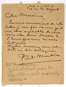 MONDRIAN Piet (1872-1944). L.A.S. « Piet Mondrian », [Paris] « 26 rue du Départ » 4 juillet 1935, à Alfred H. BARR Jr ; 1 page in-12, adresse au dos (Carte pneumatique) ; en français. « En vous remerciant de votre lettre je...