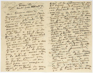 travail à Pourville. « Toujours du mauvais temps et cependant je n’ai pas trop à me plaindre de la journée puisque j’ai pu travailler à deux toiles commencées avant mon voyage à Paris mais c’est tout ce que j’ai pu faire, le matin temps incertain du brouillard et tout était si mouillé que ce n’était plus reconnaissable, et ce sera de même demain ou pire car il pleut que c’est à croire le déluge. Dans ce cas j’aurai recours à la cabine, mais là ce n’est jamais que du barbouillage et surtout pour m’occuper et me désennuyer »… Il s’inquiète de la famille : Jean, Suzanne, Jacques… « Moi je vais très bien je mouche fortement mais je crois que c’est aussi de chaleur, car il fait très doux et ne me couvre que pour ne pas être traversé et bien m’en prend, ce soir encore en rentrant j’ai écopé d’une jolie averse. Tout doit pousser à vue d’œil dans le jardin […] Bonsoir ma chérie voilà 8 h ½ je vais rentrer dans ma niche et dormir avec l’espoir que l’eau du ciel va enfin tarir et me laisser travailler »…
