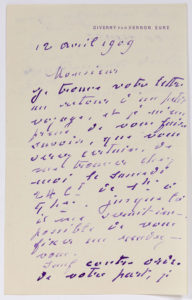 MONET Claude (1840-1926). L.A.S. « Claude Monet », Giverny 12 avril 1909 ; 1 page et demie in-8 à l’encre violette à son adresse Giverny par Vernon Eure. Il rentre de voyage et pourrait recevoir son correspondant « le samedi 24...