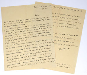 MONET Édouard. L.A.S., Paris 23 décembre 1922, à Claude MONET ; 2 pages in-4. Belle lettre sur les Nymphéas. Ce cousin de Monet le remercie pour l’inoubliable journée et pour l’œuvre incomparable qu’il leur...