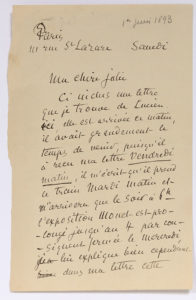 PISSARRO Camille (1830-1903). L.A.S. « C. Pissarro », Paris 111 rue St Lazare 1er juin 1893, à SA FEMME JULIE ; 2 pages in-8. Leur fils Lucien annonce son arrivée mardi soir, trop tard pour voir l’exposition MONET, qui,...