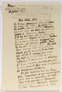 PISSARRO Camille (1830-1903). L.A.S. « C. Pissarro », Dieppe « Hôtel du Commerce » 10 juillet 1902, à SA FEMME JULIE ; 1 page et demie in-8. Il donne des nouvelles de son fils Rodolphe qui est malade et a refusé de se rendre chez...
