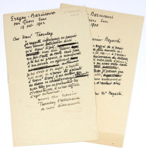 aimable invitation à la fête donnée à l’occasion de l’Anniversaire du Mikado, obligé d’être à mon poste d’observation, je n’ai pu avoir votre carte à temps. Il parait que c’était admirable, cela ne m’étonne nullement et mon regret est d’autant plus cuisant »… 19 octobre 1902, au peintre William THORNLEY (1857-1935). « Je regrette infiniment ne pouvoir vous donner satisfaction ainsi qu’à Monsr Azoef, mon ami Teissier me fait l’acte de vente sans frais je le lui ai promis je manquerai à ma parole en agissant autrement »…