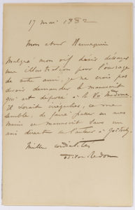 REDON Odilon (1840-1916). L.A.S. « Odilon Redon », 17 mai 1882, à son cher HENNEQUIN ; 1 page in-8. « Malgré mon vif désir d’essayer une illustration pour l’ouvrage de votre ami, je ne crois pas devoir demander le...