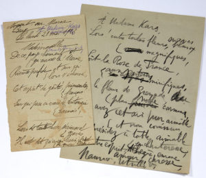 1923. Poème de trois quatrains destiné à une demoiselle : « De ce pays charmant qu’arrose la Marne Rivière perfide et sur qui lors s’acharne Cet esprit de gaîté primesautier français Sur qui pèse en vain le teutonique harnais »… À Madame Kars. Poème de 6 vers avec ratures et corrections : « Lors ! entre toutes fleurs, suaves, magnifiques, […] Vous présidez à table aimable, enchanteresse Et de votre esprit tchèque émane amour, caresse ».