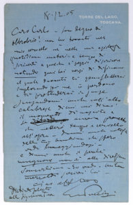 PUCCINI Giacomo (1858-1924). L.A.S. « G Puccini », Torre del Lago 18 décembre 1905, à Carlo CLAUSETTI, « Casa Ricordi » à Naples ; 1 page grand in-8 sur papier bleu à son adresse, adresse au verso avec timbres ; en italien....