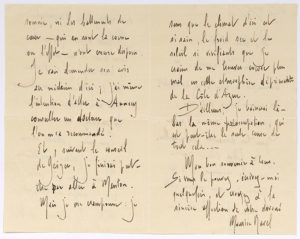 l’altitude. « Malgré la valériane, ni l’insomnie, ni les battements de cœur – qui en sont la cause ou l’effet – n’ont encore disparu. [...] suivant le conseil de GEIGER, je finirai peut-être par aller à Menton. Mais je me cramponne : je sens que le climat d’ici est si sain, le froid sec et le soleil si vivifiants que je crains de me trouver encore plus mal en cette atmosphère déprimante de la Côte d’Azur. D’ailleurs, je traînerai là-bas la même préoccupation, qui est peut-être la seule cause de tout cela »... L’Intégrale, n° 1060.
