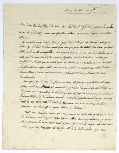 légère fente). Longue et intéressante lettre à propos d’un ouvrage dramatique et de son buste par David d’Angers. Il a terminé son nouvel ouvrage : « Vous pensez bien que je n’ai pas la prétention qu’il soit joué de mon vivant dans aucune hypotèse ; mais à tout le moins veux-je profiter du temps qui me reste pour lui choisir un compositeur qui ne soit pas simplement un croque-notes, comme cela vient de m’arriver par suite d’une bienveillance, d’une condescendance, également et mal-placées, et mal récompensées ». Pour cela, il faut que « mon poëme soit reçu, et comment s’y prendre ? à qui s’adresser ? » Il demande l’aide de Duval pour obtenir une lecture, et va lui « faire passer le manuscrit tout informe qu’en soit la copie, car c’est moi-même qui l’ai transcrit ». Il s’inquiète du sort de BÉRANGER, qui vient d’être condamné à la prison pour ses chansons et ses pamphlets : « Quel triomphe pour Mr de Champonet, pour ces exécrables jésuites, et pour la clique infernale dont ils sont les Rois ! Le sculpteur DAVID [d’ANGERS] « a fait à ma triste figure l’honneur de la modeler » et, pour le remercier, il lui a fait une promesse [une copie de la Marseillaise] qu’il n’a pas encore tenue « parce qu’elle exige une écriture plus supportable que celle-ci. Veuillez le lui dire »... Il a d’autres tracas ; il a presque fini de rembourser les 130 francs qu’on lui avait prêtés : « de quel prix ne faut-il pas payer l’honneur de n’avoir rien eû à se reprocher par les temps que nous avons vus, sans compter celui qui court ?... En attendant, j’ai été, je suis humilié jusqu’au fond de l’âme de cette ridicule incartade ; c’est un des seuls désagrémens qui me restassent encore à dévorer »…
