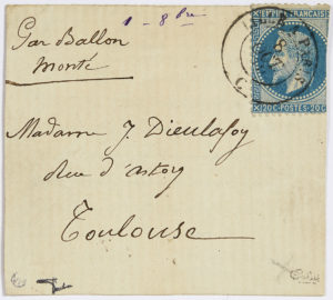 Ballon Monté - George Sand - Pli confié : 20c. Lauré (Y&T n°29) obl. du CàD de LILLE à PARIS du 8 oct 70, sur lettre à destination de TOULOUSE - HAUTE GARONNE. Arrivée à Toulouse le 10 octobre. TB.