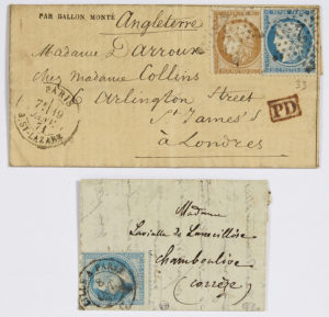 Siège de Paris : Ensemble de deux Ballons Montés : - George Sand - Pli confié. 20c. Lauré (Y&T n°29) obl. du CàD de LILLE à PARIS du 8 oct 70, à destination de TOULOUSE - HAUTE GARONNE. Cachet au verso du 10 oct. - General...