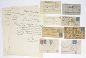 n°1 ou Jean Bart n°2 : 20c. Lauré (Y&T n°29) obl. étoile 33 sur lettre frappée du CàD de Paris du 14 oct 70, à destination de BELLEGARDE - AIN. Cachet de passage et arrivée le 22 oct, - Garibaldi : 20c. Lauré (Y&T n°29) obl. étoile 1 sur lettre frappée du CàD de Paris du 21 oct 70, à destination de MILHAU - AVEYRON. Arrivée le 2 novembre, - Archimède : 20c. Siège (Y&T n°37) obl. étoile 24 sur Journal-Poste n°5 frappée du CàD de Paris du 17 nov 70, à destination de LYON - RHONE. Arrivée le 26 novembre, - Boule de Moulins : 20c + 80c. Bordeaux obl. GC 2084 sur lettre frappée du CàD de Lorient du 4 janv 71, à desttination de Paris par Moulins. Sans arrivée. - Boule de Moulins : 20c. Bordeaux + Trace du 80c. Brodeaux sur lettre frappée du CàD de Marseille du 3 janv 71, à destination de Paris par Moulins. Sans arrivée. - On y joint d'autres documents se référant à la guerre de 70 comme un papillon de Metz.
