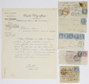 Yonne. Arrivée le 22 octobre, - Fulton : 10c. Dentelé (Y&T n°21) et 20c. Siège (Y&T n°36) obl. étoile 4 sur lettre frappée du CàD de Paris du 1 nov 70, à destination de LONDRES - ANGLETERRE. Arrivée illisible, - 2 Boules de Moulins sans arrivée dont une avec affranchissement de 5 ex. du 20c. Lauré (Y&T n°29).