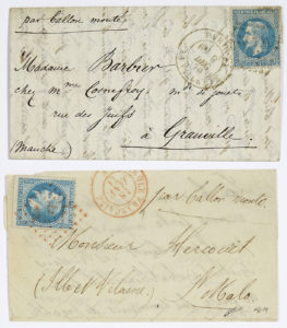 Arrivée le 29 janvier, - Parmentier (probable) : 20c. Lauré (Y&T n°29) obl. GC 4277 sur lettre frappée du CàD de Paris du 9 dec 70, à destination de GRANVILLE - MANCHE. Arrivée le 22 décembre.