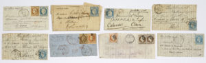 du 28 oct 70, à destination de BOSTON - USA. Taxe américaine à 2 cents, - Général Cambronne : 20c. Lauré (Y&T n°29) obl. étoile sur lettre frappée du CàD de Paris du 18 janv 70, à destination de BOULOGNE SUR GRESSE - HAUTE GARONNE. Arrivée le 1 fevrier, - Boule de Moulins : 40c. Dentelé (Y&T n°23) et paire du 30c. Lauré obl. GC 559 sur lettre frappée du CàD de Bourdeilles du 5 janv 71. On y joint Armée de la Loire (probable) à destination de BILLOM - PUY DE DOME, Lavoisier à destination de CAEN - CALVADOS et Duquesne à destination de MONS - BELGIQUE.