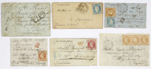 sept 71, à destination de JERSEY - ANGLETERRE. Arrivée le 4 fevrier, - Franklin : 80c. Lauré (Y&T n°32) obl. etoile 22 sur lettre frappée du CàD de Paris du 4 déc 70, à destination de ST PETERSBOURG - RUSSIE. PD en rouge au recto. Sans arrivée, - Général Renault : 40c. Lauré (Y&T n°31) obl. étoile muette sur lettre frappée du CàD de Paris du 8 déc 70, à destination de LA HAYE - HOLLANDE. Arrivée le 14 décembre, - Newton : 10c. Siège (Y&T n°36) et 20c. Siège (Y&T n°37) obl. etoile 8 sur lettre frappée du CàD de Paris du 1 janv 71, à destination de COWES - ILE DE WIGHT - ANGLETERRE. Arrivée le 12 janvier. On y joint une sortie après le siège et une marque postale de 1821.