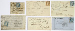 noir au verso. SUP et Rare. On y joint quatre Ballons Montés dont Garibaldi, à destination de MAINNEVILLE - EURE, Gambetta, à destination de ELBEUF - SEINE INFERIEUR, Torricelli, à destination de DIEPPE - SEINE INFERIEUR, Poste de Paris sur Agence Havas, à destination de VALENCIENNES - NORD. Et également une marque postale.
