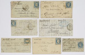 ARTILLERIE en bleu. Arrivée le 26 janvier, - Ville d'Orléans : 20c. Siège (Y&T n°37) obl. Paris SC en rouge du 23 nov 70 sur lettre, à destination de NANTES - LOIRE INFERIEUR. Arrivée le 29 décembre, - Bayard (probable) : 20c. Siège (Y&T n°37) obl. Paris SC en rouge du 28 dec 70 sur gazette des absents n°20, à destination de LOUE - SARTHE, - Fulton ou Ferdinand Flocond - Pli confié : 20c. Lauré (Y&T n°29) obl. GC 3189 sur lettre, à destination de BREST - FINISTERE. Sans arrivée. On y joint également General Faidherbe à destination de CHAMBERY - SAVOIE, Newton sur Gazette des absents n°21, à destination de GRANVILLE - MANCHE et Armée de la Loire à destination de SOTTEVILLE-LES-ROUEN - SEINE INFERIEUR.