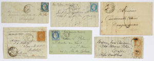 Arrivée le 2 décembre, - Denis Papin : 20c. Siège (Y&T n°36) obl. GC 2793 sur lettre formule imprimée sur papier vert frappée du CàD de Paris du 5 dec 70, à destination de ST OMER - PAS DE CALAIS. Arrivée le 11 décembre, - Washington - pli confié : 10c. Lauré (Y&T n°28) obl. CàD de Douai du 13 oct 70 sur lettre, à destination de GRASSE - ALPES MARITIMES. Arrivée le 17 octobre. On y joint un Lavoisie,r à destination de Rochefort et Jules Favre n°1 ou Jean Bart n°2, à destination de PREMERY - NIEVRE.