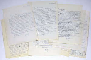 10.XII.1968. Il est accablé de manuscrits. De tous les poèmes que lui a envoyés Droguet, il en aime trois : « Le reste... ou ça me rappelle quelque chose ou ça ne me dit rien. Après tout, il est plus difficile qu’on ne croit de parler d’amour, on n’est jamais le premier ». Il aimerait « que les trois qui me plaisent paraissent dans les Lettres Françaises »… – 27/3/69. « Il est certain que je ne puis, pratiquement, écrire en détail des appréciations de chaque poème reçu, même s’ils me plaisent (vous n’imaginez pas le courrier que je reçois) »… –Quiberon 29.III.70. « Nous avons été tout ce temps gravement malades ma femme et moi et je vis avec une inquiétude de tous les instants dans le cœur. J’ai longtemps essayé par quelques signes de vie de donner le change. On n’aime guère à faire pitié. […] J’ai devant moi les sept poèmes que vous m’avez envoyés au début de 70, je ne les aime pas moins que ceux de 68. Si vous voulez bien, je vais publier l’ensemble dans Les Lettres […] vous dites, et vous avez raison, que je publie trop pour qu’on puisse tout acheter (les italiques sont de vous). Je vous le concède, mais on peut y voir le fait d’un homme qui sait que le temps lui est mesuré, et qui n’aime pas les œuvres posthumes. […] Pour qui, je vous le demande, publie-t-on des livres, quand on pourra déjà en être fatigué au bout d’une longue et lourde vie ? »… – 23/11/70. Projet de réunir « la foule de mes poètes »… – 10/I/71 : « les 25 Décembre et 1er janvier au moulin j’ai eu deux de ces crises dont Elsa est morte, et je n’arrive pas à mourir »… Il propose de publier Le Bonheur noir aux E.F.R. » – 16 février. « Mon cher enfant Deux crises d’angine de poitrine expliquent à la fois les retards de mon courrier, atroce à voir sur ma table, et l’impuissance d’écrire qui m’a fait retarder plusieurs semaines un article, écrit et déchiré une fois parce que ça ne valait pas pipette. Pardon de t’avoir ainsi tenu en haleine. Les poèmes sont beaux, j’ai réuni le tout, je m’occupe du sort de l’ensemble ces jours-ci. J’espère écrire si pas cette semaine, la suivante l’article qui me prouvera à moi-même la fin de cette impuissance d’écrire qui me prend depuis moins d’un an, et de quoi je voudrais en avoir fini »... – 23/IV. « Je m’arrange la semaine prochaine pour poser le problème de ton livre à une grande maison d’édition. Si ça ne marche pas, ce sera fait de toute façon chez moi à la rentrée »… – 1er juillet 71. « le Mercure de France éditera tes poèmes. J’avais donné à Simone Gallimard (directrice du M. de F.) un manuscrit fabriqué par moi de ce que j’avais »… – 9 mai 72. Il revient de Marseille « où se tenait la nouvelle exposition Elsa Triolet, et devait se jouer le ballet sur Maïakovski, qui nécessitait aussi ma présence. […] Ce voyage à Marseille, je l’ai entrepris en pleine crise cardiaque, et j’ai bien cru ne pas même pouvoir le faire. J’ai des ennuis dont je ne peux pas écrire, et qui rendent ce que je dis incompréhensible ». Il fait le point sur le manuscrit du Bonheur noir, dont il n’a rien « censuré »… – 8/7/73 : « je n’ai pas cessé d’être malade malgré quelques apparitions au grand air, depuis le commencement de cette année. Pas malade comme on dit pour s’excuser. J’ai failli à plusieurs reprises simplement crever. La dernière aventure remonte à moins d’un mois. Mon médecin m’a malgré mes protestations enlevé de chez moi pour m’hospitaliser à St Antoine, disant que sans cela il ne pouvait répondre de ma survie. J’ai l’air d’avoir été remis sur pied. Je suis comme on dit quelque part sur la Côte à essayer de m’en persuader. Devant le monceau des travaux entrepris et abandonnés... A vrai dire, depuis l’automne dernier, je ne suis plus moi-même »… Etc.