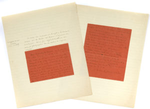 BATAILLE Georges (1897-1962). MANUSCRIT autographe, Le Supplice des cent morceaux ; 2 pages in-12 oranges collées sur 2 feuillets in-4 dont le premier comporte le titre et 5 lignes. Copie par Bataille du texte de Georges DUMAS (dans Le plaisir et la...