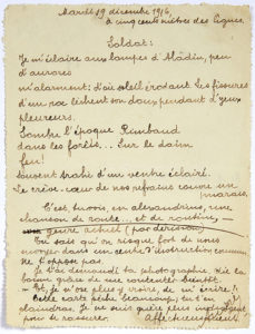 étudiant en médecine, il envoie le poème Soldat (9 vers, Œuvres complètes, Pléiade, t. I, p. 44) : « Je m’éclaire aux lampes d’Aladin, peu d’aurores m’alarment : d’où soleil érodant. Les fissures d’un roc lèchent son doux pendant d’yeux pleureurs »… Il commente ensuite : « C’est, tu vois, en alexandrins, une chanson de route… et de routine, – genre actuel (par dérision). Tu sais qu’on risque fort de nous envoyer dans un centre d’instruction commun »…