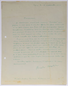 et Aragon la revue Littérature en 1919. Assez éclectique dans un premier temps, elle allait de plus en plus exclusivement publier les textes des futurs surréalistes. Au moment où il écrit cette lettre à René ARCOS (1880-1959), directeur de la toute nouvelle revue Europe, sous influence communiste, André Breton s’apprête à mettre un terme à Littérature pour fonder La Révolution surréaliste, en se rapprochant des thèses communistes.] Il désirerait vivement recevoir la revue Europe, « qui figure à mes yeux l’un des efforts les plus cohérents et les plus dignes que l’on ait pu enregistrer depuis longtemps. Accepteriez-vous l’échange avec Littérature qui, quoiqu’il vous en semble sans doute, ne poursuit pas un but opposé au vôtre, à l’encontre du plus grand nombre des autres publications ? Jugerez-vous trop osé de ma part de vous soumettre deux manuscrits de poèmes, simplement en signe de confiance et sans me flatter assez de l’espoir qu’il vous plaira de les insérer dans un numéro de votre revue pour qu’un refus de votre part me désoblige de quelque façon. Mais je publie incessamment un recueil de poèmes [Clair de terre] et j’attacherais un grand prix à ce que vous présentiez l’un de ceux-ci à vos lecteurs, établissant par là une légère concordance entre nos actions »….