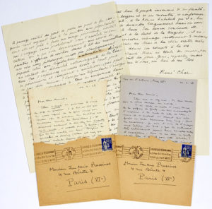 pierre au pont de fer suspendu vaut aujourd’hui à la peinture une popularité dont elle est prête à faire un usage pernicieux contre qui s’engage sans protectorat sous l’auréole de son tablier. […] Ce qui séduit et inquiète chez Jean Mario Prassinos c’est d’abord son agressivité toute parcourue d’estime du travail singulier et de dégoût des laideurs fragiles. […] Je vois fort bien le peuple insoumis de ses fantômes, de ses bergers, de ses monstres, se conformer par exemple à la bonne habitude qu’il a lui, Prassinos de descendre longuement dans son verre avant de le boire. Son dessin soucieux de l’ampleur et de la durée de la tragédie, s’il entame des prévisions, ménage visiblement le moment où l’Humour au bras de la chère vieille mère du vinaigre donne son compte à la Vie »… On joint le petit catalogue de l’exposition Dessins & gouaches de J.M. Prassinos avec le texte imprimé de René Char (galerie Billiet, février-mars 1938). Plus 2 l.a.s. d’Henri PARISOT à Mario Prassinos, 11 et 14 février 1938, relatives au texte de René Char (2 p. in-8, enveloppes).