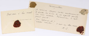 CHAR René (1907-1988). POÈME autographe signé « R.C. », Prévaricateur ; 1 page oblong in-8 (12 x 26,5 cm), ornée sur 3 coins de cachets de cire. Poème en prose recueilli dans Chants de la Balandrane (1977). Le présent manuscrit, offert par...
