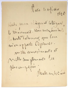 CHATEAUBRIAND François-René de (1768-1848). L.A.S. « Chateaubriand », Paris 11 février 1825, à un collègue ; 1 page in-4. « Voilà, mon obligeant collègue, le manuscrit. Vous aurez sans doute la bonté d’ordonner qu’on m’en apporte...