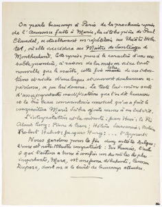 CLAUDEL Paul (1868-1955). MANUSCRIT autographe, [1948] ; 2 pages in-4. Commentaire sur la reprise de L’Annonce faite à Marie au Théâtre Hébertot en 1948 avec un fragment de l’acte I. [Rappelons la genèse et le long travail de remaniement de...