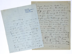 Chatte. Sois tranquille, elle est grasse et belle, et se porte à ravir : elle est remplie de mille chats. Mais sa fidélité me fend leur cœur. Tous les matins c’est la même recherche de vous deux, les mêmes cris, que j’étouffe avec une quantité de lait chaud. Elle a voulu, à cause du voisinage des chambres, adopter Hélène [PICARD], mais Hélène est trop peu libre de ses mouvements [...] pour accepter que la chatte couche chez elle. [...] Avant-hier matin [...] elle dormait profondément en compagnie de trois chiens inconnus. Elle est sur la table devant moi, belle à ravir, et elle baille parce qu’il y a déjà quatre heures qu’elle n’a pas mangé. J’y cours. [...] Je partirai sans doute le 5 d’ici. Comme je couche en route, c’est à Hélène-Pauline-Bel Gazou que je confierai Pampékesse. Tempête depuis 5 jours, et pas chaude du tout ! Les enfants vont bien. Bertrand [de JOUVENEL] prend 100 gr. par jour, il rentre lundi matin. Sidi [son mari, Henry de JOUVENEL...] part pour Genève [à la S.D.N.] samedi soir. [Charlotte] LYSÈS quitte Rothéneuf pour la Touraine. Toute sa smala est venue déjeuner hier , [Ramon] FERNANDEZ, quand on l’a vu deux fois et surtout qu’on a joué aux billes avec lui, est proprement irrésistible »... Lettres de la Vagabonde, p. 161.