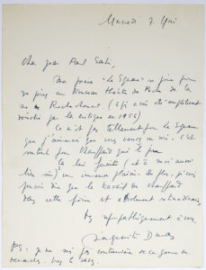 DURAS Marguerite (1914-1996). L.A.S. « Marguerite Duras », Mercredi 7 mai [1958], à Jean-Paul SARTRE ; 1 page in-4. « Ma pièce Le Square se joue pour 30 jours au Nouveau théâtre de Poche de la rue Rochechouart (après avoir été complètement...