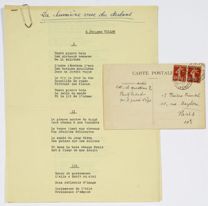 Théodore FRAENKEL : « Amitiés. Est-il question ?... Paul Eluard qui a passé l’âge ». [Arosa 9.I.1929], à Janine BOUISSOUNOUSE : « Ma chère Janine, naturellement, à la fin de mon poème d’hier il faut lire “purifient” et non “font plus pur”. Je n’ai pensé qu’à l’action, et je n’ai pas eu assez souci du mot. Voulez-vous corriger vous-même et soigneusement. Bien gratter l’étourderie comme ça, que personne n’en sache jamais rien. Et perdre cette carte au fond d’un grand bois noir, tout noir. Votre ami Paul ». Tapuscrit d’une série de 5 poèmes, dédiée à Jacques Villon, avec titre autographe : La lumière vue du dedans, et une grande signature « Paul Eluard ».