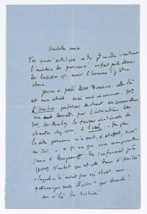 FLAUBERT Gustave (1821-1880). L.A.S. « Gve Flaubert », [Paris] Jeudi [vers 1878, à Marguerite CHARPENTIER ?] ; 1 page et demie in-8 sur papier bleu (légère fente au pli médian). Lettre inédite à la femme de l’éditeur Charpentier. « Ma...
