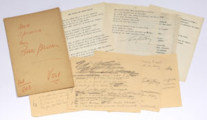 de la campagne menée contre son élection à l’Académie Goncourt (et il le désignera comme un des responsables de son arrestation à la Libération). Le manuscrit, de 30 vers, présente de nombreuses ratures et corrections ; en marge, Guitry a numéroté les strophes dans leur ordre définitif. Son opinion est bien entendu « défavorable » : Brisson n’a jamais fait « le moindre mot d’esprit » ; il se vautre dans le dénigrement et vivote du travail des autres ; il est plus bête que méchant et « est convaincu qu’il n’aime pas nos pièces. « Nous ne voudrions pas d’ailleurs qu’il les aimât. Si on me demandait : Cette haine mortelle Ah ! çà mais d’où vient-elle ? Je répondrais : de l’estomac. Quel teint cireux, quel air sinistre et délavé ! Il a l’air de poser pour un médicament Qui guérit tout : les reins, le pancréas, les vents […] À la sottise humaine il met un point final Il est minus et terminus Et j’aime bien qu’il soit directeur des Anales Puisque qui dit “anal” intéresse l’anus ». On joint le tapuscrit signé, Mon opinion sur Pierre Brisson (avec variantes), et 2 doubles dactylographiés. Provenance : collection André BERNARD (vente 17-18 novembre 2011, n° 508).