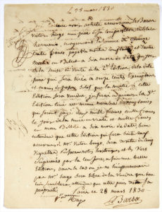 été créée le 25 février 1830.] Le contrat est écrit par l’éditeur Jean-Nicolas BARBA (1769-1846). « Je déclare avoir acheté à monsieur le Baron Victor Hugo une pièce de sa composition intitulée Hernani, moyennant la somme de quinze cents francs, payable moitié comptant et l’autre moitié en billet à six mois de date du jour de la mise en vente de la 2e édition de la dite pièce qui sera tirée à onze cents exemplaires et mains de passe. Sitôt que la moitié de cette édition sera vendue, je ferai imprimer la 3e édition tirée au même nombre d’exemplaires » qui seront payés également en deux fois, « bien entendue que cette édition qui fera suite aux œuvres de Mr Victor Hugo sera revetue de cinq vignettes, Préfaces, notes historiques et les vers suprimés par la censure, enfin une belle édition. Dans le cas où je ne l’imprimerais pas Mr Hugo sera libre de la vendre à qui bon lui semblera, attendu que cette pièce reste sa propriété ». Hugo signe avec l’apostille « approuvé l’écriture Vor Hugo ». Au verso, Victor Hugo a écrit de sa main : « Si Monsieur Barba ne fait que la première des deux éditions comprises dans le marché, M. Hugo rentrera dans sa propriété au bout de six mois à partir de la date de la mise en vente. Pour la deuxième de ces éditions, M. Hugo rentrera dans sa propriété un an après le jour de la mise en vente. M. Hugo signera les livres de chacun des exemplaires des deux éditions ». Barba approuve l’écriture.