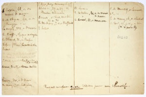 HUGO Victor (1802-1885). P.A., 1849 ; 1 page oblong grand in-8. Liste de noms avec adresses, dressée sur 4 colonnes. On remarque des noms de comédiens et comédiennes : Marty, Blonval, Persont et Rival, du journaliste Hippolyte Lucas, etc. En bas...