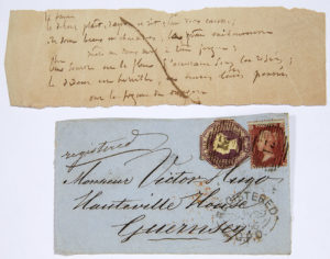 passé et tout l’avenir, dans La Légende des siècles (II, XIX) ; le sizain, avec variantes alternatives, est très différent du texte définitif : « Le dehors/La femme plaît, rayonne et rit ; ; leur/sa voix caresse ; Ils sont beaux et charmants ; la grâce enchanteresse Mêle un doux miel à leur/son jargon ; Leur/Son sourire est la fleur s’ouvrant sous les rosées ; Le dedans est horrible, et toutes leurs/ses pensées Ont la figure du dragon. » * Note au crayon au verso d’une enveloppe timbrée à son adresse à Guernesey (26 juillet 1856) : « Au couronnement de la reine, il se répandit dans Guernesey qu’il y aurait un feu de joie sur le fort. Melle Le Boutillier [logeuse de Juliette Drouet] prêta son parloir à ses amis qui vinrent pour voir le feu de joie, il n’y eut rien que deux ou trois lumignons, et le capitaine Collas dit : C’est de quoi triste, et je m’en vais. » On joint une L.S. d’Alphonse de LAMARTINE, 31 mars 1852, à M. Deluz, libraire à Saint-André-de-Cubzac, pour l’abonnement à son journal Le Civilisateur (2 p. in-8, adresse).