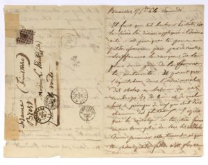 [HUGO Victor]. DROUET Juliette (1806-1883). L.A.S. « J. », Bruxelles 15 septembre 1866 ; à son neveu Louis KOCH à Brest ; 3 pages in-8, adresse avec timbre et cachets postaux (petites réparations au f. d’adresse). Lettre à son neveu évoquant...