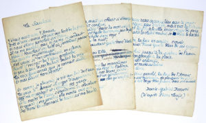 Debussy. Dans La Saulaie, Pierre Louÿs a adapté en vers libres trois des quatre sonnets recueillis sous le titre Willowwood dans The House of Life (1870) du peintre-poète Dante Gabriel ROSSETTI (1828-1882), à l’intention de son ami Claude DEBUSSY, qui a longtemps travaillé, de 1896 à 1900, à La Saulaie, pièce pour baryton et orchestre, restée inachevée (voir Denis Herlin, « Une œuvre inachevée : La Saulaie », Cahiers Debussy 20, 1996, p. 3-23). Le texte de Louÿs a été publié dans L’Esprit français du 10 septembre 1931. Le manuscrit, à l’encre bleue sur papier vélin filigrané Joynson Superfine, de la belle et ample graphie de Louÿs, présente, dans le second poème, des corrections à l’encre noire remaniant un vers : « Les ombres de ces jours à nous qui n’avaient pas de langue », devenant « Fantômes de nos jours de silence, … autrefois ». On notera l’humour de la signature : « Dante-Gabriel Rossetti (d’après Pierre Louÿs) ». « J’étais assis avec l’Amour Près d’une source obscure au bord de la forêt Et nous étions penchés sur l’eau. […] Et comme j’étais penché, la face de l’Amour Se pressa sur ma nuque en pleurant de pitié Jusqu’à ce que nos deux têtes fussent dans son auréole. »