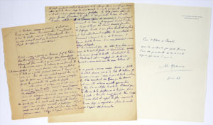 ont été écartés du roman Les Conquérants (Grasset, 1928), et concernent le passé de Garine ; ils présentent des ratures et corrections, et semblent inédits. Le premier, sur papier quadrillé provenant d’un cahier d’écolier, doit correspondre à une déclaration de Garine : « La Révolution se produira d’abord en France ou en Russie. […] Il faut renoncer à jamais au Royaume Juif de Palestine. Nulle couronne nul boulet n’est plus accablant qu’un idéal mort. Il faut les abandonner, comme les cadavres de nos parents. Il le faut. C’est nécessaire. Je ne renonce pas moi-même sans combat à suivre l’étoile qui a guidé pendant 2000 ans les hommes de notre race. Mais elle nous conduit aujourd’hui vers la mer, et, derrière nous, à la place des moissons saccagées, je vois les innombrables têtes courbées des peuples. L’enthousiasme de quelques-uns d’entre nous et le respect de tous les autres, devant l’espoir donné par le livre, commencent à faire notre faiblesse. […] nous sommes encore émus de la souffrance de ceux qui nous ont formés, du son de ces paroles par lesquelles Israël a exprimé son vieux génie misérable et prophétique. Il faut rompre avec tout cela, chercher notre force dans notre dispersion même. Oublions le Royaume »… L’autre fragment, écrit au dos d’un feuillet à en-tête de la revue L’Indochine, dirigée par Malraux et Paul Monin, évoque Garine à Paris : « Il était cependant sensible à la douceur de la ville, au fleuve amical qui tourne autour de Notre-Dame […] Ces paysages lourds d’une gloire sanglante que venaient tout naturellement compléter les marchands de livres et d’oiseaux, l’amenaient à trouver à la vie de la douceur, et, parfois, à chercher les allégories dont les hommes de sa race pourraient orner leur capitale reconstruite. […] Au-delà de ces livres sacrés il voyait les étoiles graves de la nuit de Judée et l’horizon des sables. Au-dessus de la rumeur apaisée de la ville, il entendait les murmures désespérés de l’Ecclésiaste […] Il habitait une de ces grandes maisons divisées en petites chambres, où l’on enferme les artistes pauvres près de la porte d’Orléans. Il allait quelquefois à Montparnasse parce que, parmi les gens de toutes nations qui se réunissent là, il rencontrait des Russes qui lui faisaient connaître certaines nouvelles dédaignées du Comité. Mais il n’aimait pas les artistes »… On joint une P.A.S. d’envoi de ces pages, probablement pour une vente caritative : « Pour l’État d’Israël, avec les souhaits que peut former l’un des présidents de la L.I.C.A. depuis pas mal d’années André Malraux Juin 48 » (1 p. in-4).