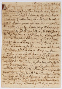 prie Boileau de donner six louis d’or à leur ami Cassandre, afin qu’il achève une constitution de rente, ou quelque bâtiment qu’il a entrepris : « je vous les feray rendre par Monsieur Rainssant qui sera dans quinze jours à Paris ; car vous sçaurés que M. l’archeveq. de Reims, nous enleve notre Esculape, et le donne a Monsieur de Louvois pour son medecin ; il faudra être bien mal conseillé pour tomber malade à l’avenir dans la cité du Sacre, ce sera bien cette fois là qu’on dira personne ne voudra plus etre malade »... On pourra donc jouir de Rainssant à Versailles et à Saint-Germain. « Je luy dois cette justice de vous asseurer qu’il ny a personne qu’il ayme plus que vous après qu’il a dit sur le bel esprit tout ce que tout le monde en dit »... Maucroix a appris que Boileau avait déménagé : « vous habités le Palais du Silence cest a dire le cloistre de Notre Dame ; Dieu vous y conserve de longues années, si je retourne jamais à Paris, je ne manqueray pas de vous aller rendre mes devoirs. Je vois votre maison d’icy ». Il charge Boileau de ses « baise-mains » à RACINE. « Je ne scay si LA FONTAINE luy aura dit que Mr de Colligny n’a pas icy les papiers dont vous avés besoin. Il sera bien-tost a Paris vous pourrés le voir. Il loge rüe des Bons Enfans ce me semble, c’est une rüe ou sont les Ecuries du Palays royal, rüe qu’on a elargie et ou l’on a fait beaucoup de belles maisons ».