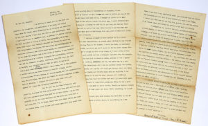anglais. Longue lettre relative à Autant en emporte le vent (Gone with the wind), deux mois avant la publication du roman. [Le Dr Charles Warren Everett, professeur au Columbia College, avait travaillé comme lecteur pour l’éditeur Macmillan et examiné le manuscrit de Mitchell avec enthousiasme, amenant la signature du contrat avec la maison d’édition. Il incita Mitchell à approfondir ses recherches sur la guerre civile et à réviser considérablement son roman.] Margaret Mitchell remercie Everett pour son soutien et décrit son travail pour l’écriture du livre. Elle retrace la genèse de son roman, commencé pour le plaisir alors qu’elle était en convalescence après une fracture de la cheville.. La guerre civile était l’une des rares choses qu’elle connaissait un peu. Le prénom de l’héroïne, Pansy O’Hara, fut changé en Scarlett, etc. Avant d’envoyer son livre à un éditeur, son mari fut son seul lecteur, un lecteur qui a pour la langue anglaise un grand respect qu’elle ne partage pas. Après la recommandation d’Everett qui déboucha sur le contrat, Mitchell comprit la nécessité de vérifier avant la publication l’exactitude de chaque ligne et de chaque mot de cet énorme manuscrit : les gens disposaient-ils de brosses à dents à l’époque ? le général Johnston avait-il bloqué le général Sherman à Kennesaw Mountain 27 ou 30 jours ?... Chaque détail devait être vérifié… Elle prend plaisir à rappeler les remarques flatteuses d’Everett sur son écriture, le rythme de sa prose, ce qui provoqua de nombreuses plaisanteries dans le cercle familial et domestique... Etc.