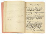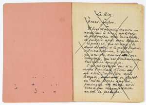 intitulé sur la couverture « Le Rire. Essai » (30 pages), dans lequel Pagnol a esquissé ses Notes sur le rire, publiées chez Nagel en 1947. Le cahier présente notamment le brouillon de l’« Avant-propos », biffé après rédaction d’une nouvelle version, dans laquelle ont dû être intégrés quelques passages ici découpés : « Il est bien téméraire d’écrire un essai sur le rire, après tant de philosophes et de moralistes, et surtout après Henri Bergson. Cependant, ma concierge a le droit de vote […] C’est cet exemple qui m’a donné l’audace d’écrire un essai sur le rire après Bergson, ou plutôt en même temps que lui, parce que son œuvre est si vivace que chaque édition en est la première »… Etc. On trouve à la suite des notes pour le plan du livre, des « Critiques de Bergson » en 4 points numérotés, ainsi que des développements sur « l’Indifférence », ennemi du Rire, et sur le rire de la foule : « la foule rit plus facilement qu’un individu isolé »… La fin du cahier est consacrée, en 1949, aux démêlés de Pagnol avec la Gaumont, protestant notamment contre les comptes incomplets qui lui sont fournis et les frais énormes de publicité, alors qu’il a lui-même assumé avec M. Roux une grande part de la publicité par des articles et des interviews (pour La Belle Meunière) ; on trouve également des brouillons de lettres et déclarations relatives à la dissolution de la société des Films Marcel Pagnol ; et des notes diverses, dont la liste de ses films en vue d’un travail de révision : Regain ramener à 3.500 Angèle ramener à 3.700 Boulanger bien Puisatier un peu long César à raccourcir Marius ’’ Fanny ’’ Schpountz à remonter Topaze à remonter »… Etc.