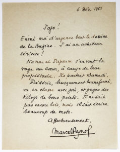 PAGNOL Marcel (1895-1974). L.A.S. « Marcel Pagnol », 6 décembre 1951, à « Jojo » [Joseph MARTINETTI] ; 1 page in-4. Il envisage de vendre son château de la Buzine (évoqué dans Le Château de ma mère) : « Envoie-moi d’urgence tout le...